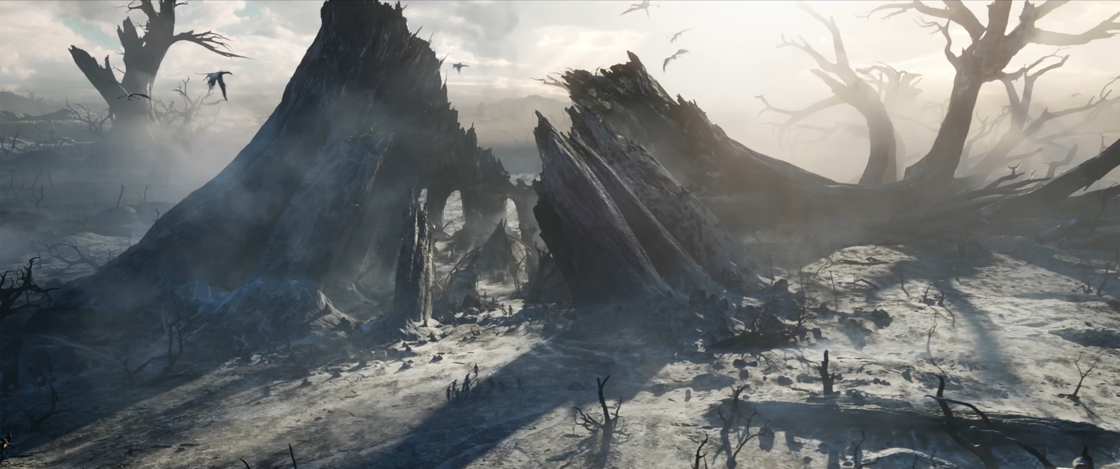 ~ Blocking, modeling, and texturing the central burnt HomeTree fortress and the surrounding forest of dead trees.