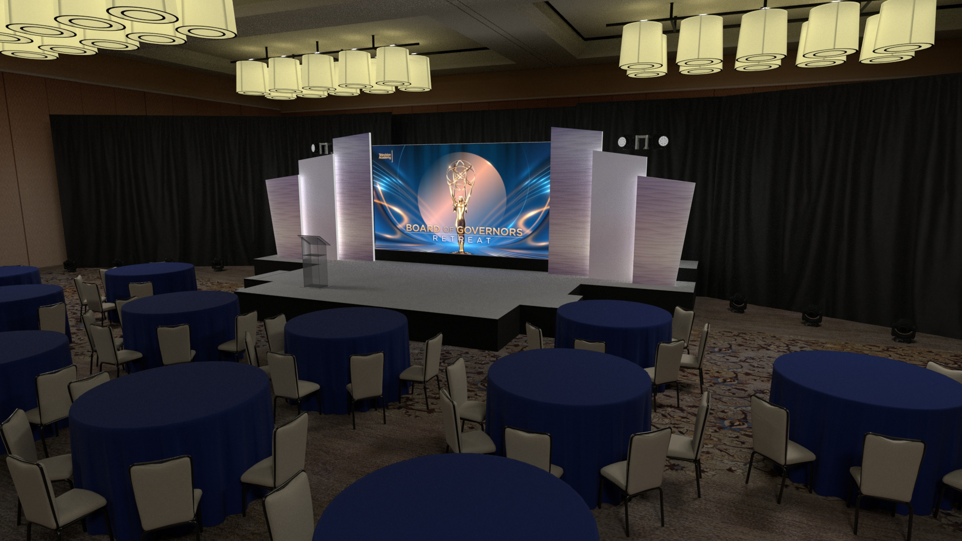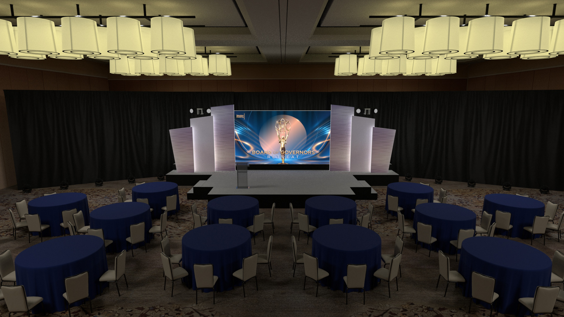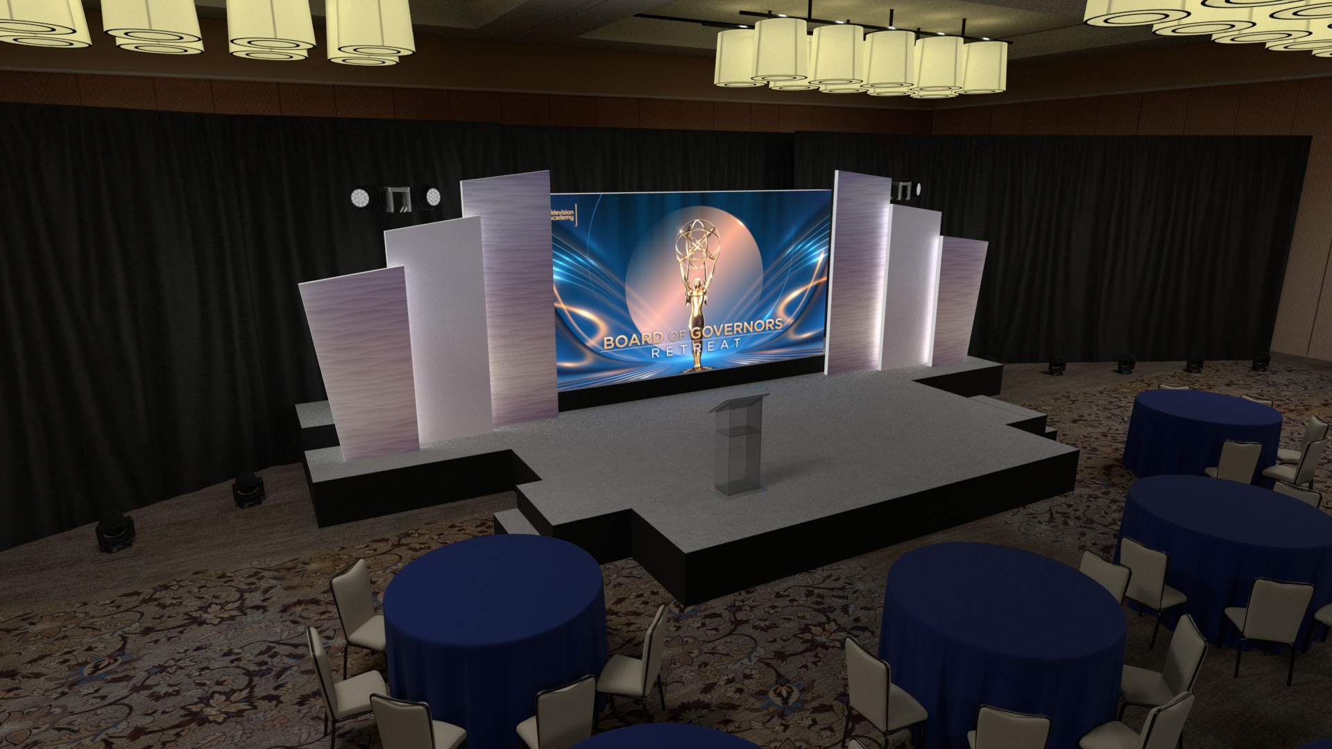 For the TVA – BOG Retreat Conference, I developed a series of high-detail previsualization renders, accurately recreating the Terranea Resort - Palos Verdes Ballroom in Maya using reference photography and floor plans. I designed multiple stage layout concepts to explore scenic design, staging configurations, drape treatments, and overall atmosphere. All scenic elements - including staging, soft goods, and décor - were modeled in Maya and textured in Substance Painter and Photoshop. The scene was then lit to present multiple lighting scenarios, allowing the client to evaluate mood and production direction. Final imagery was rendered in Arnold, emphasizing spatial composition, material finishes, and aesthetic tone to support client review and production planning.